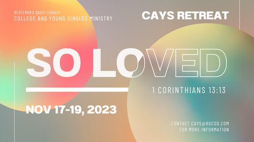 Join us this year for our 2023 College And Young Singles Retreat where we will learn about God's love! How are we SO LOVED by Him? Come and find out! Mark your calendars and be excited for November 17-19th, 2023!