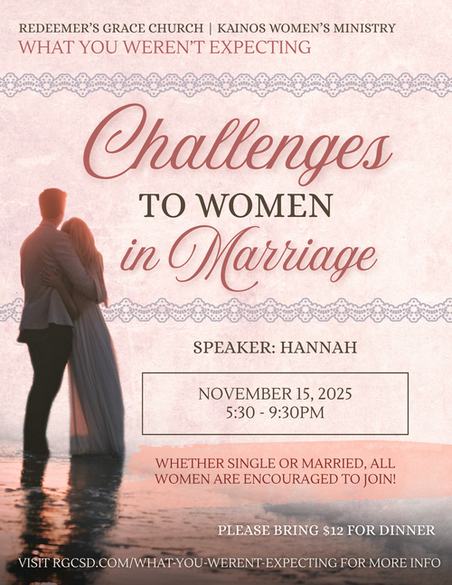 So married life didn’t turn out the way you expected—now what? Maybe you’re struggling to adjust to new changes, feeling weighed down by challenges in marriage, or even single and wondering what marriage is really like. Wherever you are, we invite you to join us at “Challenges to Women in Marriage” to be equipped to see marriage from God’s perspective and how He works all things for good. Come and be excited to learn how to glorify God in your life regardless of what challenges you may face!