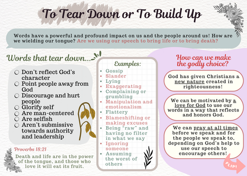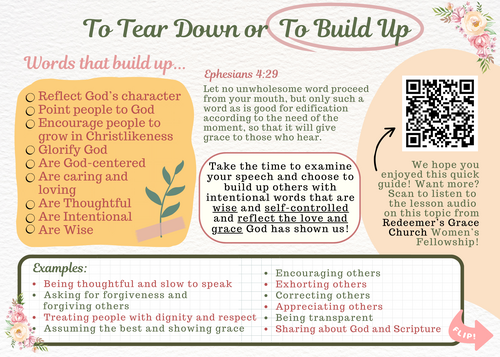 This postcard was developed from the Women’s Fellowship lesson titled “To Tear Down or To Build Up” and highlights what it looks like to use your speech to tear down or to build up. We hope this resource helps you to reflect God’s character and speak words that build others up!