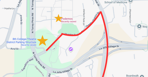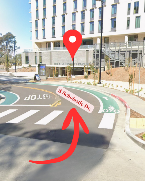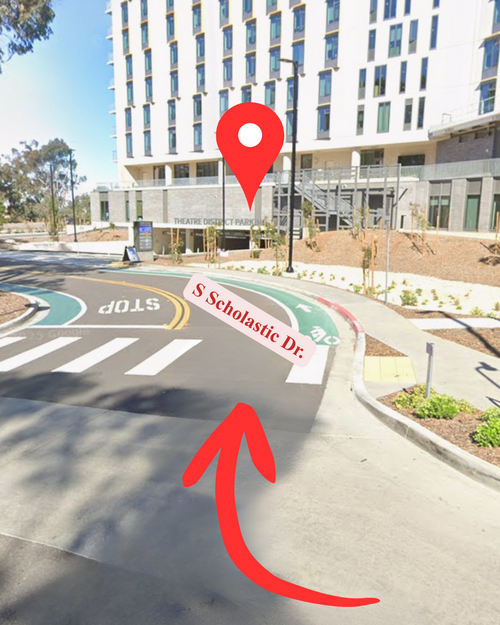 - Turn right onto Revelle College Drive, then turn left into S Scholar Drive where you will find the Theatre District Parking Structure.