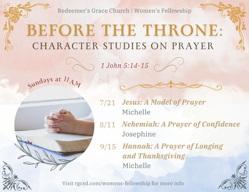 Women's Fellowship is a teaching series in which the women learn from God's Word and enjoy biblical fellowship with one another. This summer, we will be going through lessons centered around the theme, “Before the Throne: Character Studies on Prayer.”