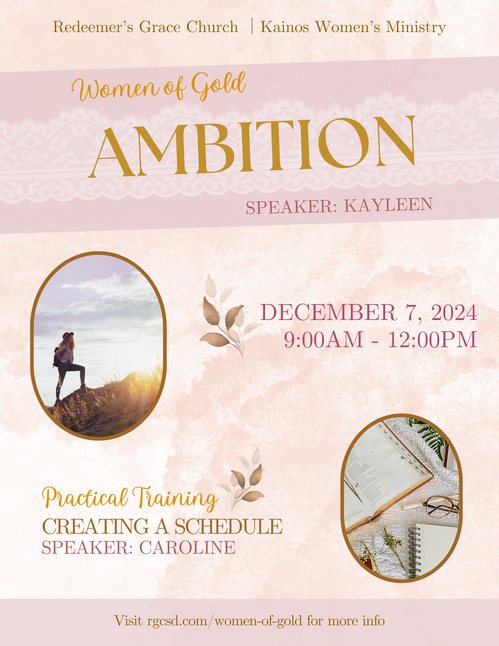 Women of Gold was a fun and refreshing time of fellowship with other sisters. We heard God's Word taught by our sister, Kayleen, in a lesson titled, “Ambition.” She defined ambition as “a love for God that leads to an all-encompassing, sold-out dedication to pursue your God-given purpose through hard work and determination” based on 2 Corinthians 5:9. Kayleen walked us through the definition of ambition by identifying ambition’s motivation, magnitude, and manner.