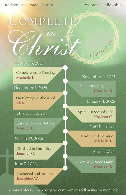 Women's Fellowship is a teaching series in which the women learn from God's Word and enjoy biblical fellowship with one another. This year, we will be going through lessons centered around the theme, “Complete In Christ.”
