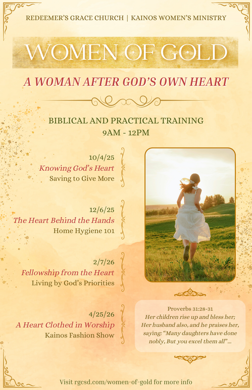 Women of Gold is focused on equipping women to become godly women who pursue excellence in all areas of their lives. At these events, you will learn more from God's Word about how to live a godly life and engage in a training component aimed at teaching women useful life, wife, and home skills.